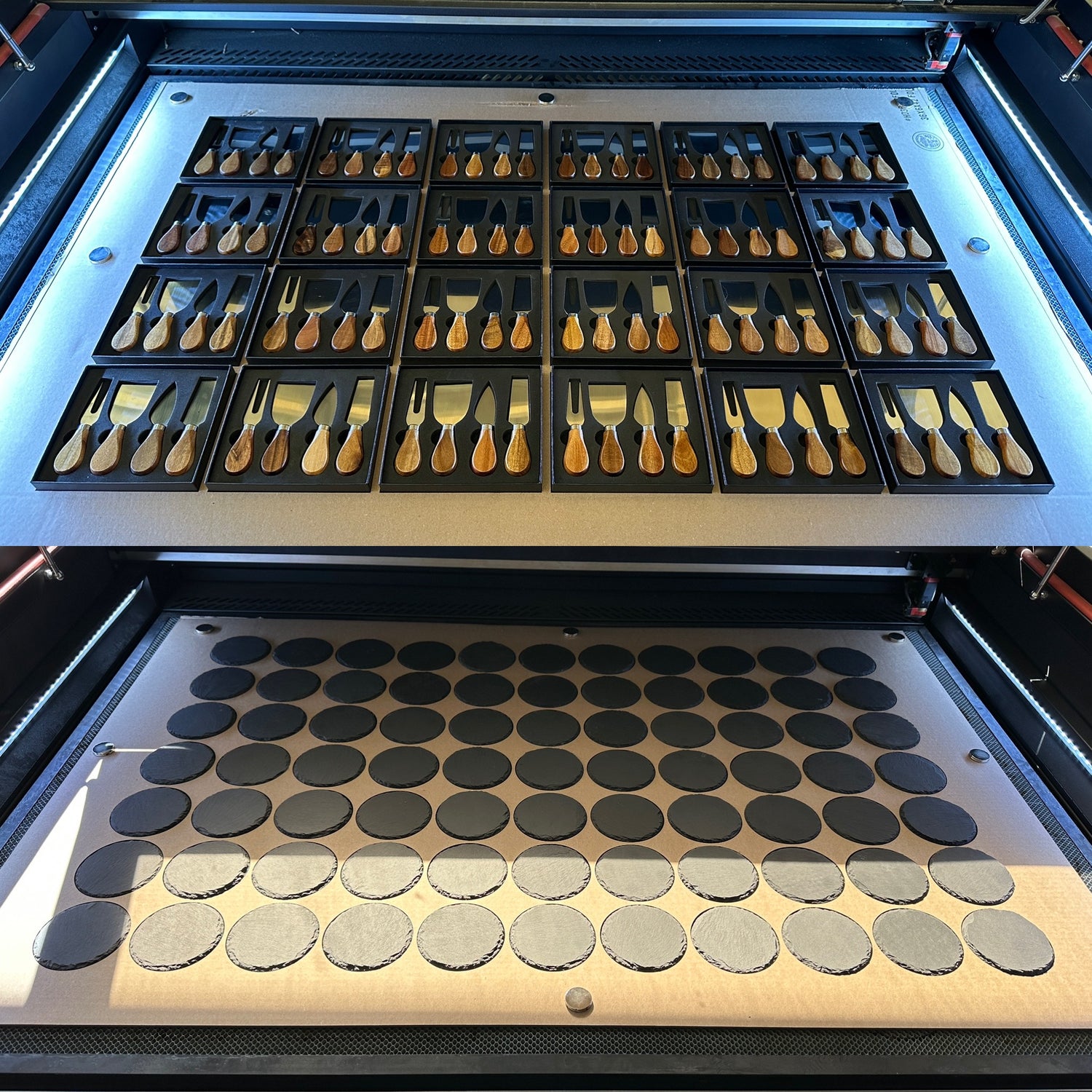 Lasers come in different forms for different materials. We currently use a hybrid CO2 laser with a working area of 35" x 55." This gives us the flexibility to handle large jobs that most can't. Wood, leather, glass, acrylic, and powder-coated items are the most compatible materials for this type of laser.
